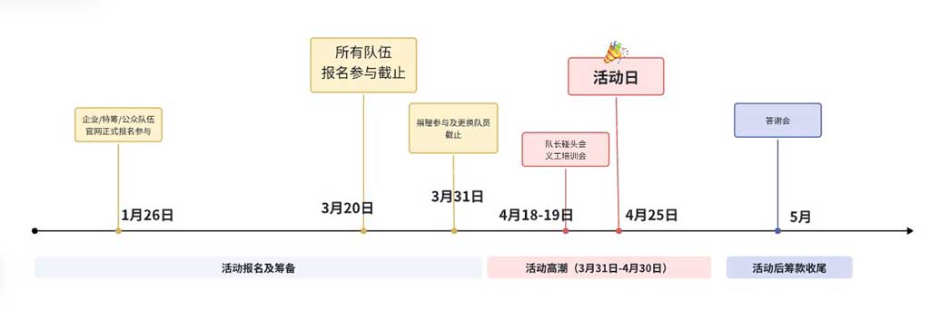 – 企业团体队伍:每队不低于30,000元 – 特邀荣誉队伍:每队不低于10,000元 – 公益组织队伍:每队不低于30,000元 – 公众队伍:每队自设筹款目标,建议不少于人均500元 筹款周期:可通过个人或队伍专属筹款海报开启筹款,当年活动筹款截止于2026年5月31日23:59。 |