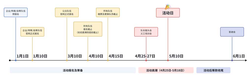 – 企业团体队伍:每队不低于30,000元 – 特邀荣誉队伍:每队不低于10,000元 – 公益组织队伍:每队不低于30,000元 – 公众队伍:每队自设筹款目标,建议不少于人均500元 筹款周期:队伍成功缴纳报名费后及锁定名额,可通过个人或队伍专属筹款海报开启筹款,当年活动筹款截止于2025年5月31日23:59。 |